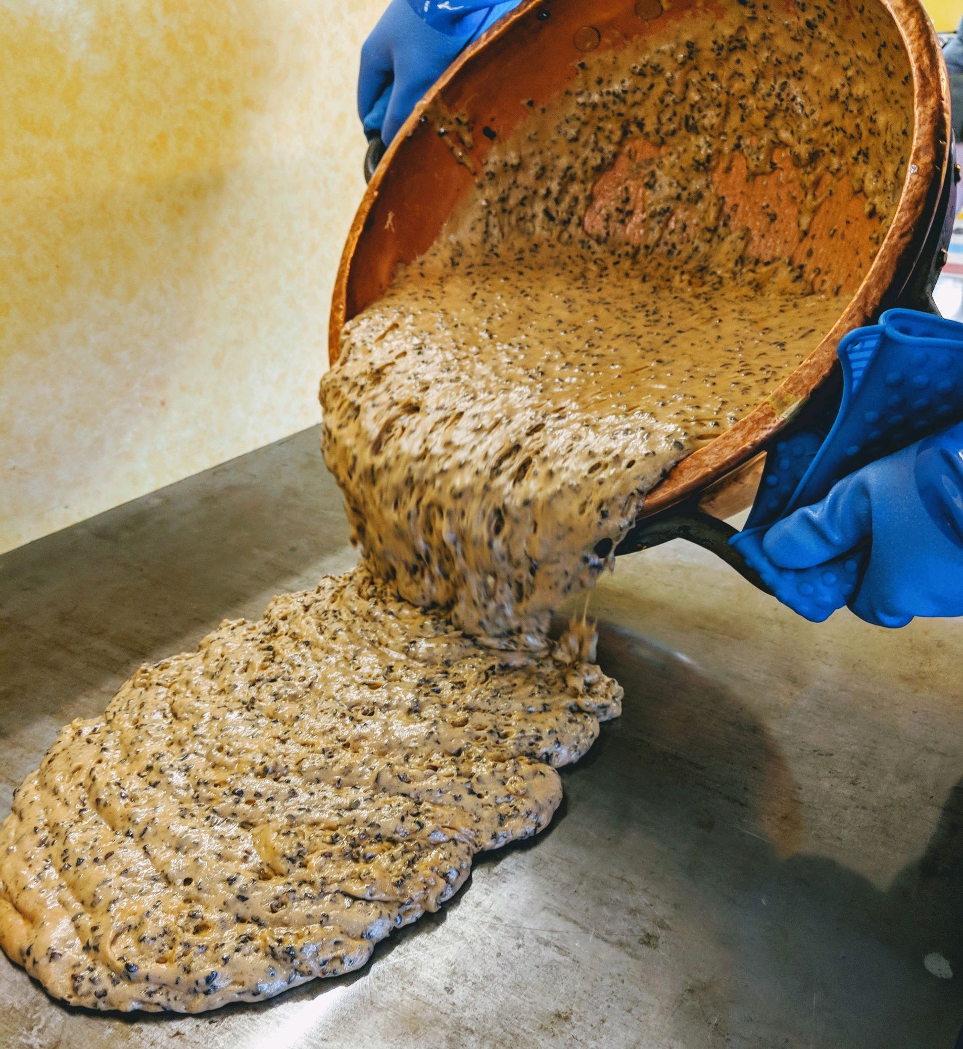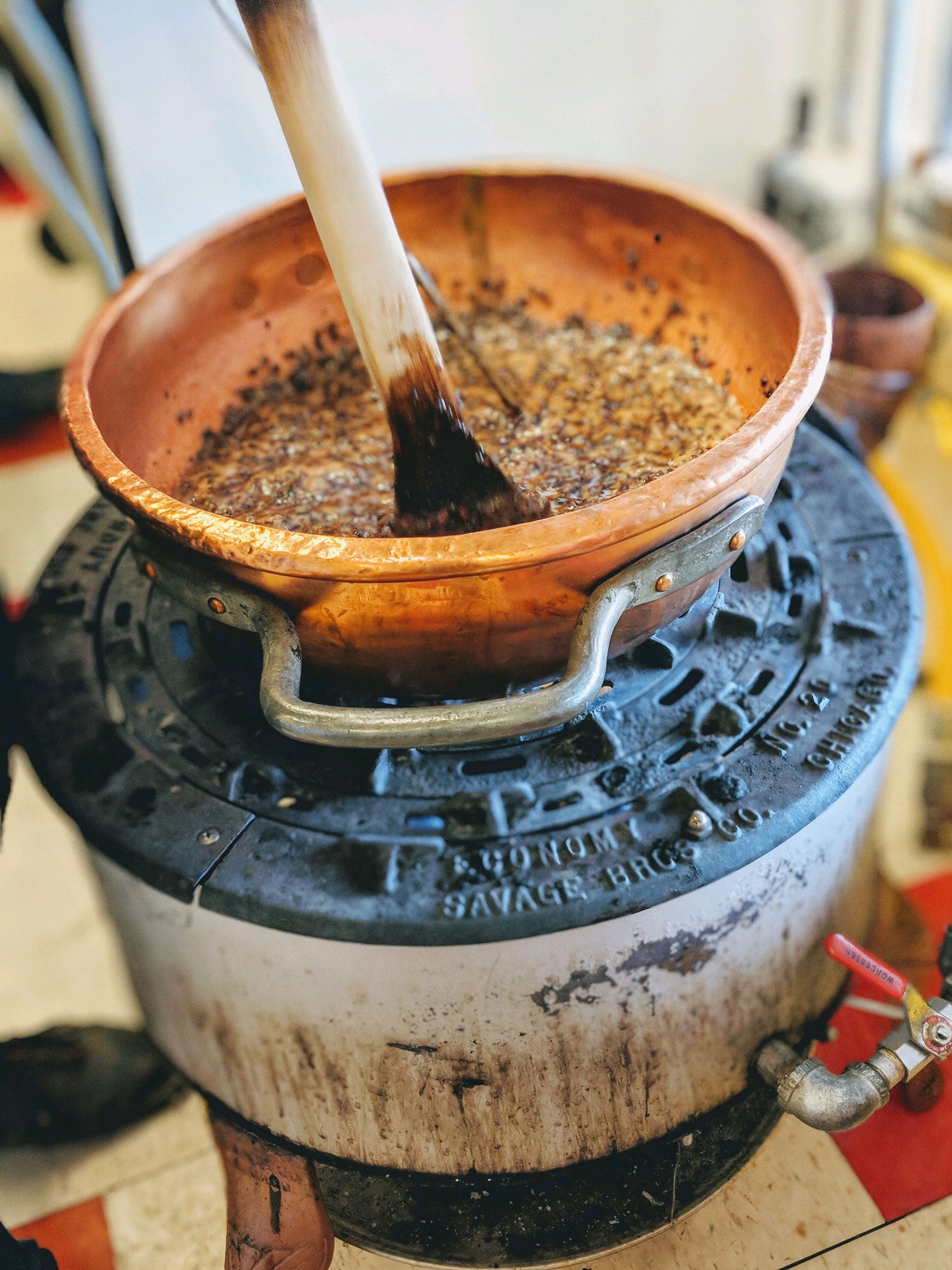 Handcrafted the old-fashioned way in a 100+ year-old copper kettle. As the brittle nears its perfect golden stage, we stir in cocoa nibs—just at the right moment—infusing the candy with deep, rich chocolate flavor. Each batch takes over an hour and demands constant care and attention. There are certainly faster ways to make brittle, but there's something about this vintage method that just feels right—and tastes even better.